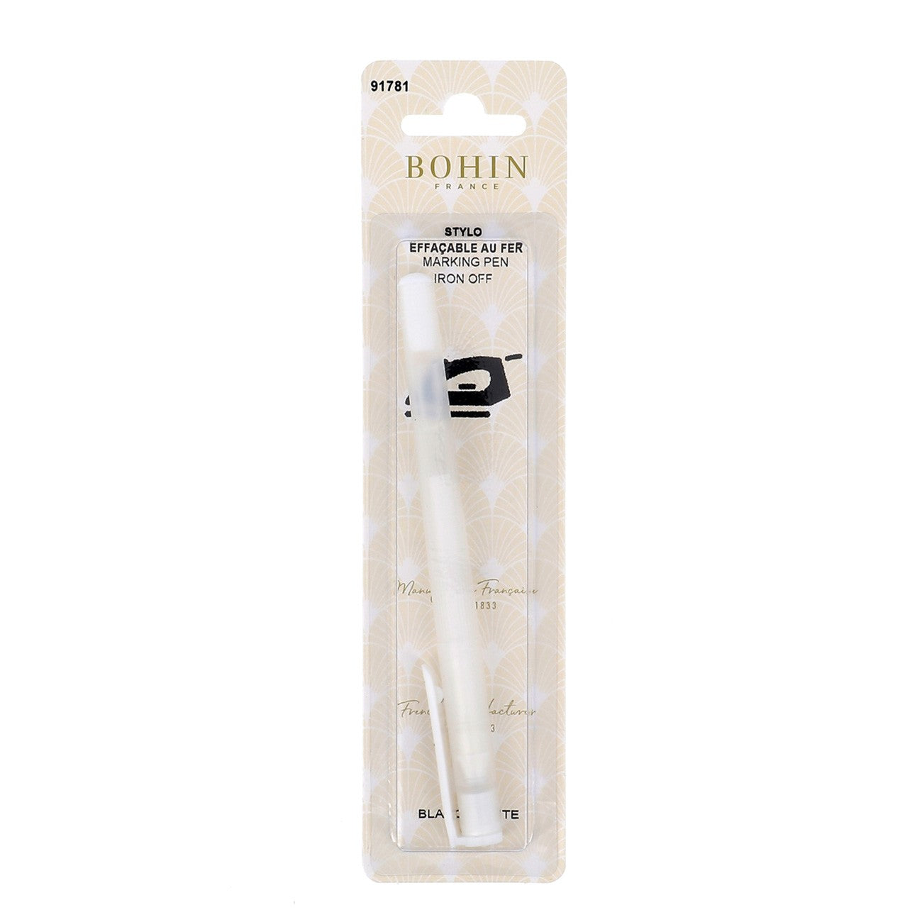 Blue water-soluble fabric marking pen with eraser tip in clear plastic packaging, showing dual-ended design and instructional diagrams.