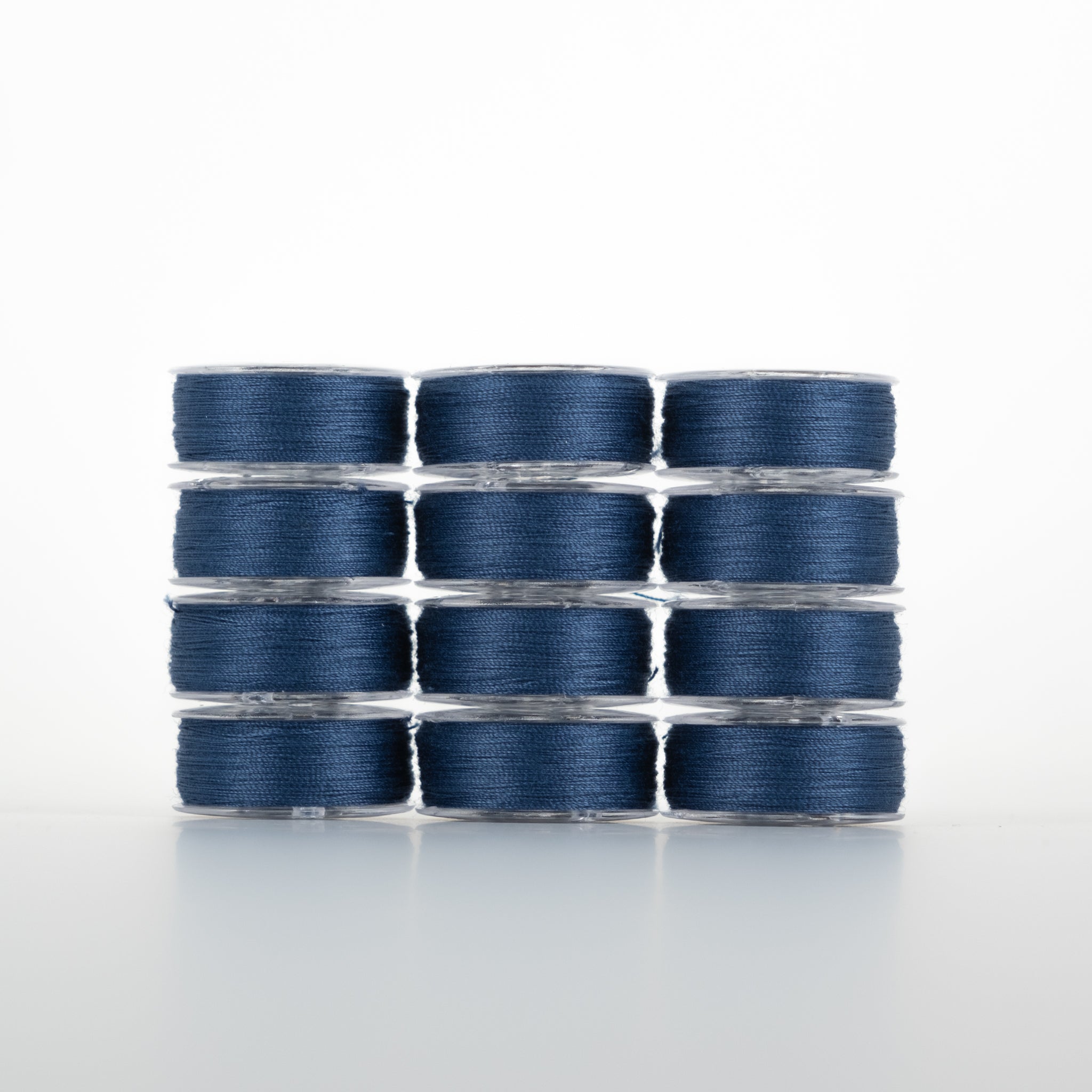 Navy blue cotton thread on prewound bobbins in clear plastic packaging, 12 bobbins arranged in rows